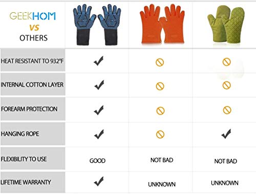 FULL GEEKHOM WARRANTY - GEEKHOM provide 12-month WARRANTY & 60 days money back Guarantee for our heat resistant oven gloves! Enjoy this absolutely RISK-FREE purchase today by clicking the yellow 'Add to Cart button' above.