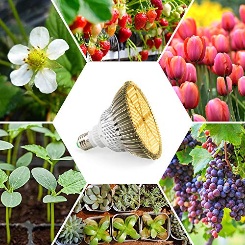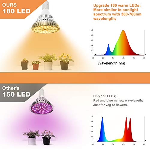 Sunlike Full Spectrum : Upgraded sun spectrum LED grow light bulb with 180 PCS High-efficiency warm LED chips, providing similar to sunlight and more highly uniform light for plants, and can improve the efficiency of photosynthesis.