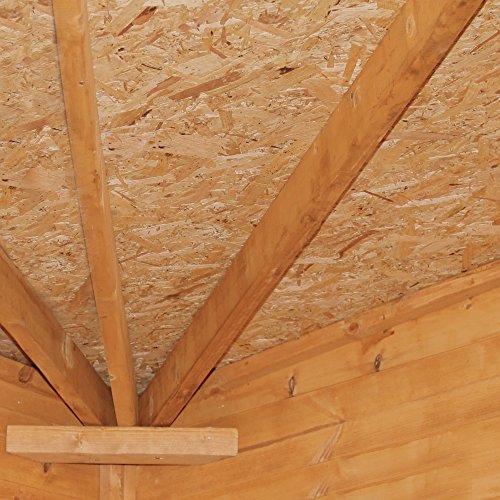 This wooden corner summerhouse features 12mm shiplap tongue and groove cladding, 10mm solid sheet board floor and 8mm solid sheet roof. It also features a rim lock, large styrene windows and 10 year anti-rot guarantee.