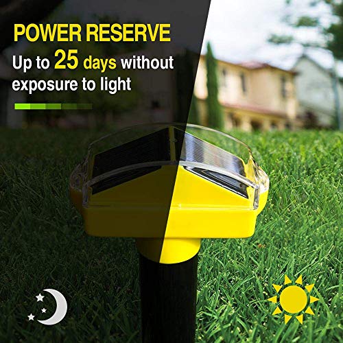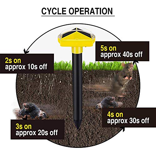 ◆ A solar powered sonic rodent repellent radiates in all directions. It is recommended to overlap the device providing even more coverage.Need 7-15 days of continuous use for mole, gopher, vole and other burrowing rodents to leave the area.