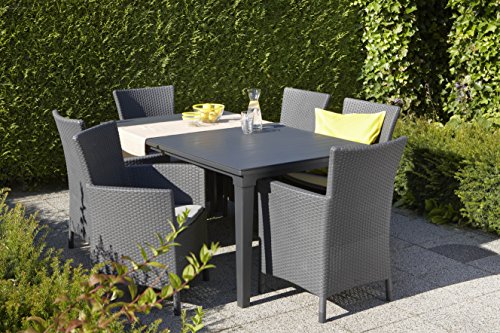 A high quality garden table in modern loft effect is for six chairs made from polypropylene. The plastic table is cold and UV resistant. Colour: Grey Dimensions L x W: 165 x 95 cm