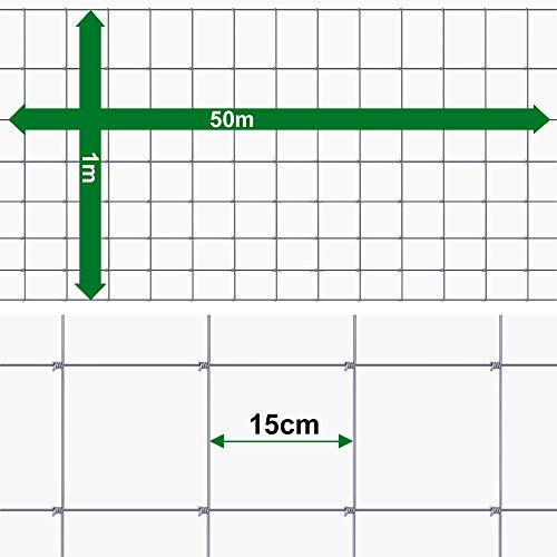 HEAVY DUTY & HIGH STRENGTH: Premium stock wire fencing in dimensions of 1m high x 50m long. Hot dipped galvanized steel stock fencing, light weight with 8 horizontal wires and 15cm distance between vertical wires. Thickened wires design with 13 gauge ( 2.3mm) top and bottom wires, 14 gauge ( 2.0mm) balance horizontal wires. Hinge jointed for high strength to resist against animals, intruders and agricultural wear and tear.