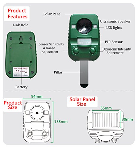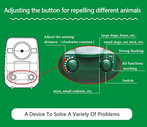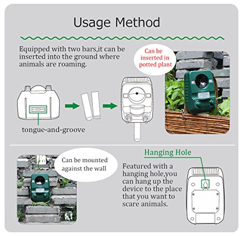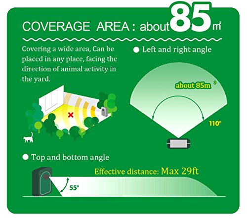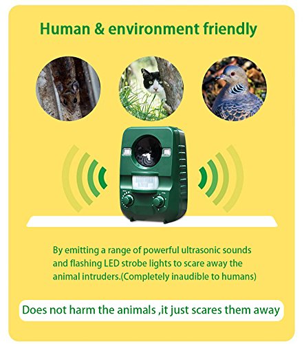3.The ultrasonic is really powerful to scare efficiently. It happens that human can hear part of its range (young people and children). So put the device as far as possible from human life place to avoid annoyances.
