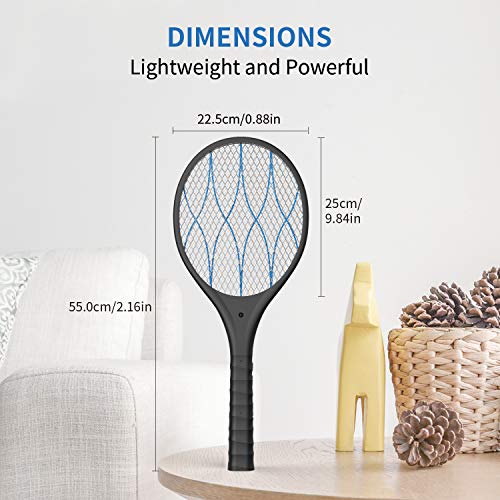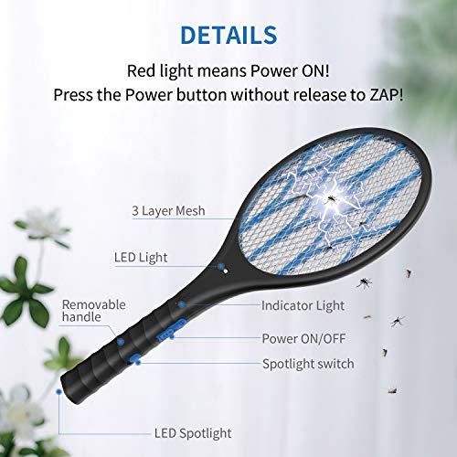 【SAFE SYSTEM】--The fly zapper racket with 3-layers mesh design for safety,always keep your hand safe from the high voltage grid. If others touch this powerful pest control tool while electrified, unique 3-layers safety grid can protective. And the fly zapper electric with the double insurance switch, designed for protecting your safety,so you needs to press and hold the power button to kill insects.