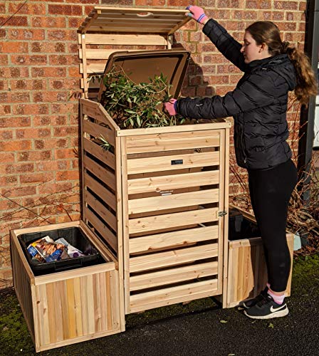 BinGarden Single Wheelie Bin Store with Bi-Fold Roof and matching Planters. Garbage Shed for up to 240L Bin / 65G Can. Planter Boxes for storage of two Kerbside Recycling Boxes, Natural Colour