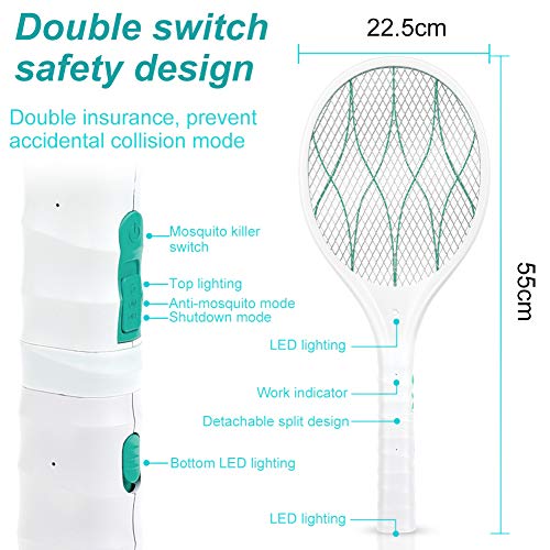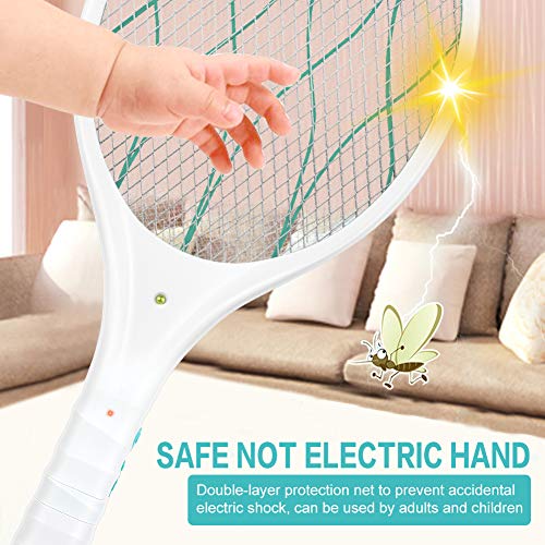 ➤【Safe to Touch】: Press the activation button on your bug zapper racket, and an indicator light glows. Should you or others touch This powerful pest control tool while it’s electrified, a triple-layer safety mesh protects you