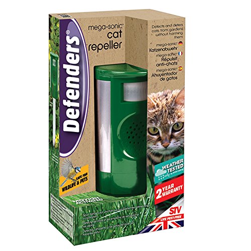 Motion activated repellent emits a continuously variable sonic burst which is irritating to cats so they move away from gardens and lawns; motion can be detected up to 12 m away; cat deterrent provides 50% more coverage than equivalent devices
