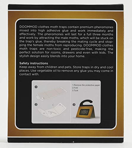 HOW TO GET RID OF MOTHS: The DOOMMOD moth trap lures in the male moths using non-toxic odourless pheromones and traps them against a sticky board. This prevents them from breeding with females and creating cloth-eating larvae. The result is a closet or carpet free from infestation – without the nasty odour of moth balls for your wardrobe.