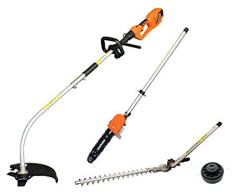 The Ultimate Garden Machine ! eSkde ESMT4 4 in 1 Electric Brushcutter / Strimmer / Hedge Trimmer / Chainsaw Pruner Kit. New Model with Split Shaft allowing you to swap attachments to suit the task in hand. The eSkde range of garden tools offers a solution for every occasion, their rugged and sturdy design stands out amongst the crowd and allows even the toughest of tasks to be completed with ease. The ESMT4 Electric 4 in 1 Garden Multi Tool System is the latest design incorporating a tough lightweight split shaft system to quickly change attachments depending on the task in hand. The high power efficient 900w motor gets you straight to work with the minimum of fuss - simply plug in - and away you go !. It's ergonomic front handle and shoulder strap allows the greatest of movement with the least amount of effort allowing you cut a greater area more quickly. It comes supplied with both a 3 tooth cutting blade, a nylon line strimmer head, a multi angle adjustable hedge trimmer and a multi angle adjustable chainsaw / pruner attachment. Specifications 900w Electric Motor No Load Speed - 6900rpm Long 10m Power Cable Simple ergonimic finger controls Swift Joint easy split shaft connection system Cutting Width 36cm (Grass Trimmer) / 23cm (Brush Cutter) Bump Feed Spool Pruner Chainspeed - 13m/s Pruner Bar - 10" Hedge Trimmer - No Load Speed - 1000rpm Hedge Trimmer Cutting Capacity - 20mm Hedge Trimmer Cutting Length - 410mm In the box. ESMT4 Motor Unit Bent / Curved Lower Shaft Attachment 3 Tooth Blade Nylon Line Strimmer Head Hedge Trimmer Attachment Chainsaw / Pruner Attachment Shoulder Strap Manual Tool Kit Stock Status Brand New, Retail Packed, 12 month warranty