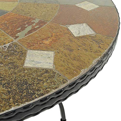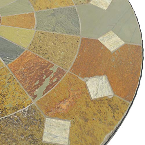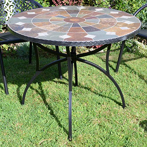 GRANADA PATIO TABLE - Made from natural stone laid by hand in a mosaic style with red and brown colour tones, the top has a centre parasol hole and cap. This heavy duty patio table is supported on black powder coated steel legs. Assembly is quick and easy with just 4 bolts.
