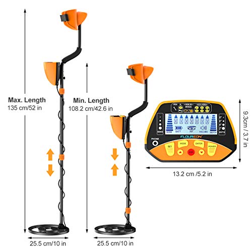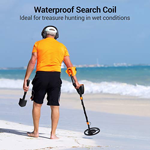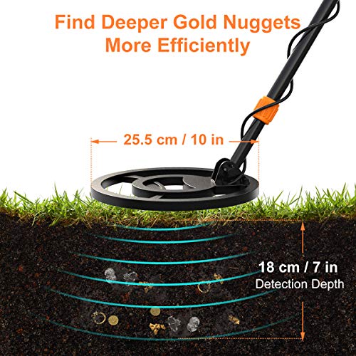 ➤HIGH SENSITIVITY Metal Detector: 25.5 cm(10 inches) diameter waterproof search coil detects coin-sized objects up to 18 cm(7 inches) depth, and deeper for larger metal,allows you to find gold nuggets more efficiently and cover more ground.
