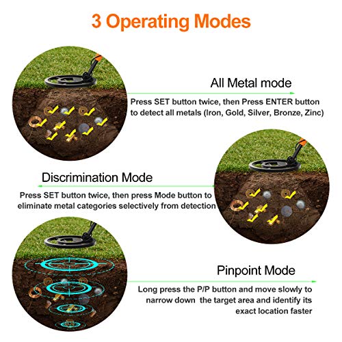➤ALL METAL&DISC MODE: This metal finder will detect all types of metal under All-Metal mode, and also useful to distinguish between target and unwanted metal under DISC mode; it has three tones of beep sound for different metal which makes it easier to identify the metal underground(you can check details of every sound means in user manual).