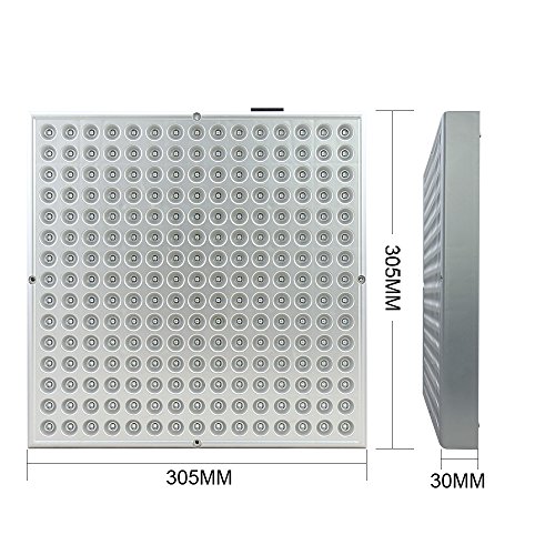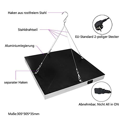 Specifications: size of the plant lamp: 305 x 305 x 30 mm; Weight: 1.18 kg. Recommended irradiation distance: 40cm - 100cm. Irradiation range: approx. 2㎡. With mains plug. Cable length approx. 120cm.