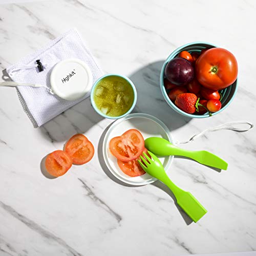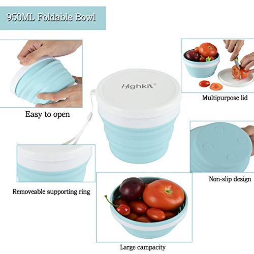Highkit Reusable Camping Dinner Set with Spoon and Fork.Portable Silicone Collapsible Bowl 950ml,X-Large Travel Folding Cup/Mug with Lid 350ml for Outdoor and Hiking