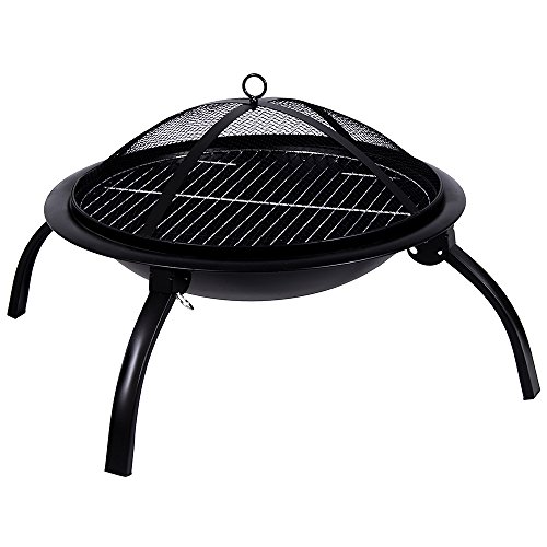 This fire pit features a fire bowl, mesh cover, charcoal grate, cooking grill, a poker and four foldable legs making this portable pit easy to carry. Made from sturdy and durable steel, this pit can be used as a barbecue and is easy to clean and maintain.