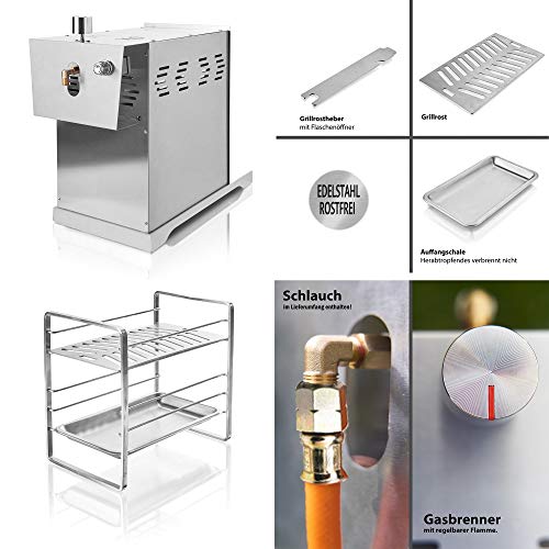 Special promotion/price for the start of the holiday [everyone can be a barbecue master] JOM 800 °C top heat gas grill, which can be heated to over 800 °C within a short time – stainless steel, dimensions: 220 x 535 x 410 mm, grill surface: 265 x 157 mm, power: 3.5 kW / 800 °C, freely regulated, includes removable grease tray, grate holder and gas low pressure regulator – thanks to this strong gas grill gives the grill grill grill gives the top heat well. real steak professionals.