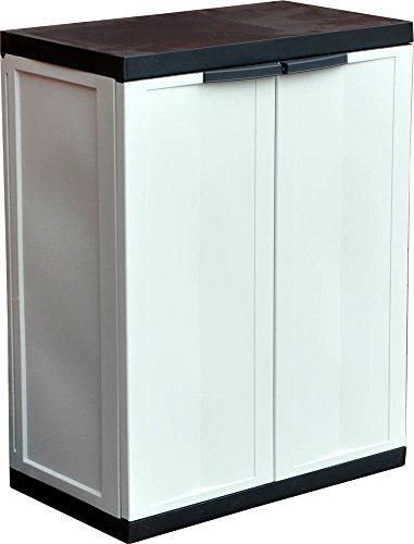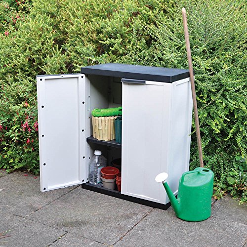 Handy upright storage cabinet from Kingfisher garden supplies. Made from plastic this cabinet has twin front opening doors and internal shelving to provide storage for tools and other garden sundries