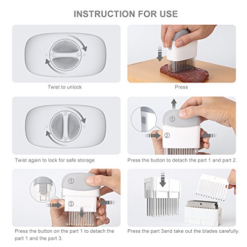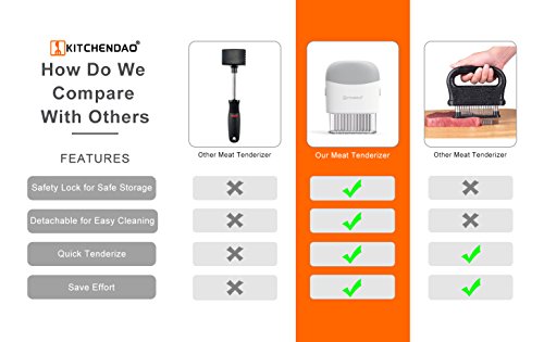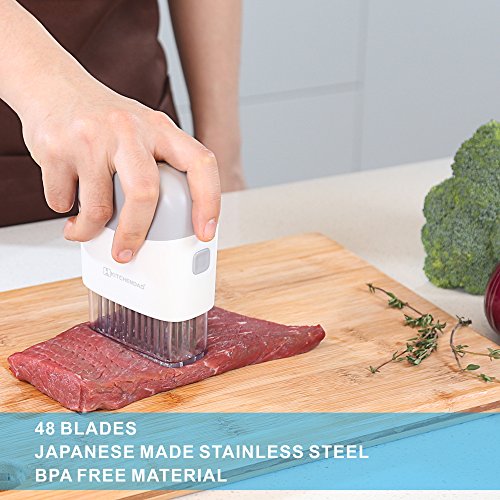 THE BEST MEAT TENDERIZER TOOL: 48 razor sharp blades break down the connective tissues that makes the toughness of the meat and making it hard to eat. Penetrating knives create tiny heat channels within the meat. Reduces cooking times by up to 40% resulting in much more juicy and flavorful meat as the cooking heat has less time to dry out the meat. Provides pathway for marinades to be absorbed deeper into the meat which increases absorption by up to 600%. Allows heat to penetrate the meat evenly