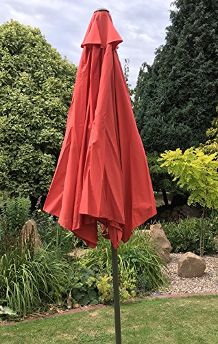 A popular 2.7m or 3m wide large crank and tilt garden parasol umbrella with a stylish powder coated brown 38mm metal pole with a 11cm circumference. 180gm polyester parasol material top cover to protect from the sun and light rain, with wind vents at the top and a smart finial on top.Easy to use crank mechanism system; turn the crank handle in the direction shown on the fitting, taking care not to overwind the parasol. Dimensions: 2.7m Parasol - 270cm diameter, 243cm height. 3m Parasol - 300cm diameter x 243cm height. We do recommend the use of a parasol base suitable for 38mm poles. 2.7m parasols can use 9kg, 12kg, 15kg, 25kg. 3m parasols required a minimum of 12kg for stability for your garden umbrella. A heavy duty waterproof parasol cover will also help protect your parasol from the elements. Do not use your parasol in windy conditions.