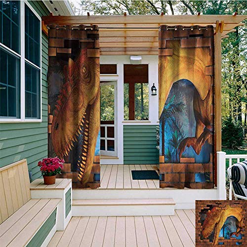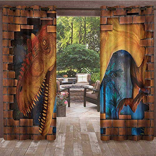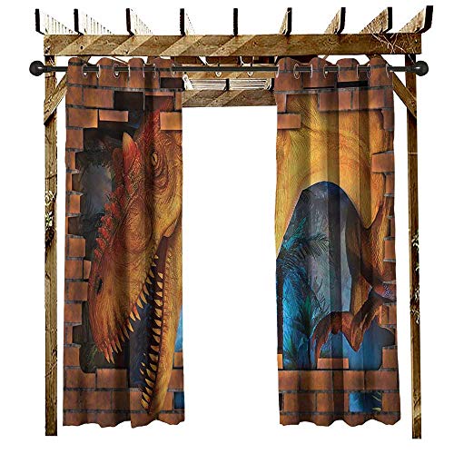 leinuoyi Dinosaur, Outdoor Curtain of Lights, Tyrannosaurus Breaks a Brick Wall Frightening Scary Scenery Jungle Invaded House, for Patio W84 x L96 Inch Orange Blue - Image 1