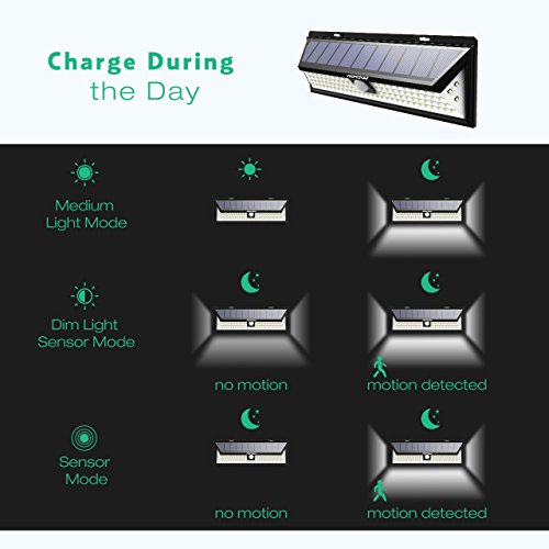 3. Sensor Mode: The light charges in the day and stays off in darkness or at night when no motion is detected. It will turn to bright light when motion is detected and last about 17 seconds. The light will go off when there is no motion.