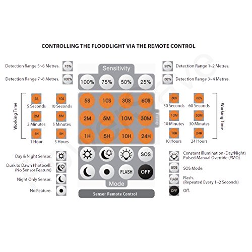 Remote controlled meaning you can change between the different light modes and adjust the detection range sensitivity (from 2m to 8m), duration etc without having to climb a ladder