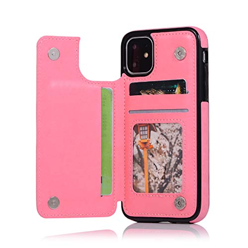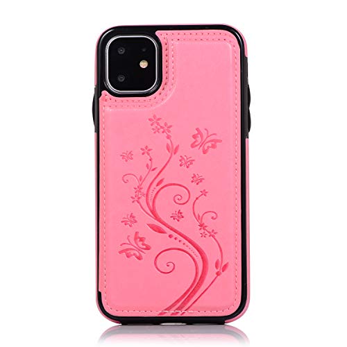 QFUN Back Wallet Case for iphone 11 with Stand, Elegant Embossed Design [Butterfly Flower] Lightweight Slim Fit Leather Phone Case with Card Holder Protective Bumper Flip Cover - Pink
