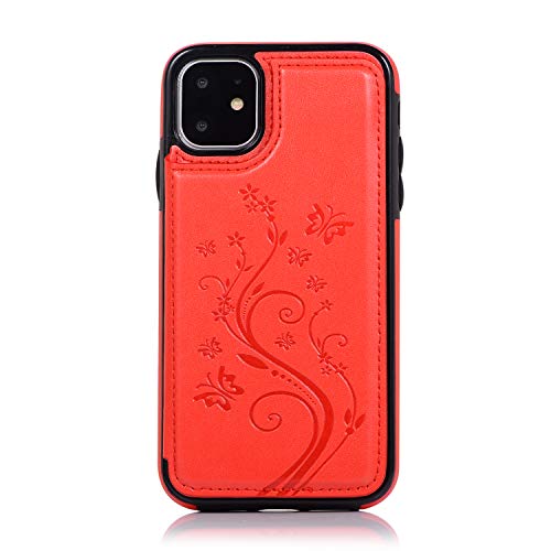 QFUN Back Wallet Case for iphone 11 with Stand, Elegant Embossed Design [Butterfly Flower] Lightweight Slim Fit Leather Phone Case with Card Holder Protective Bumper Flip Cover - Red