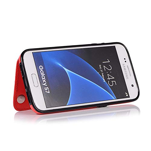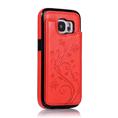 QFUN Back Wallet Case for Samsung Galaxy S7 with Stand, Elegant Embossed Design [Butterfly Flower] Lightweight Slim Fit Leather Phone Case with Card Holder Protective Bumper Flip Cover - Red