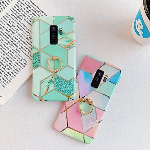 Saceebe Compatible with Galaxy S9 plus Silicone TPU,Glittered case TPU Soft Silicone Marble Pattern Soft Shell TPU with Finger Ring Bracket Protective Shell Case Cover [Anti-Scratch],Pink blue