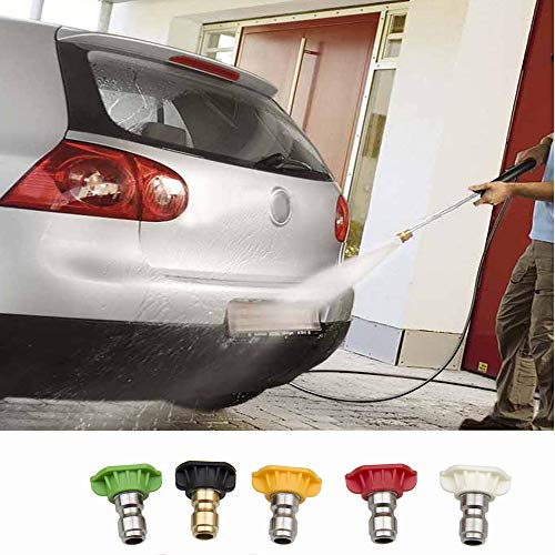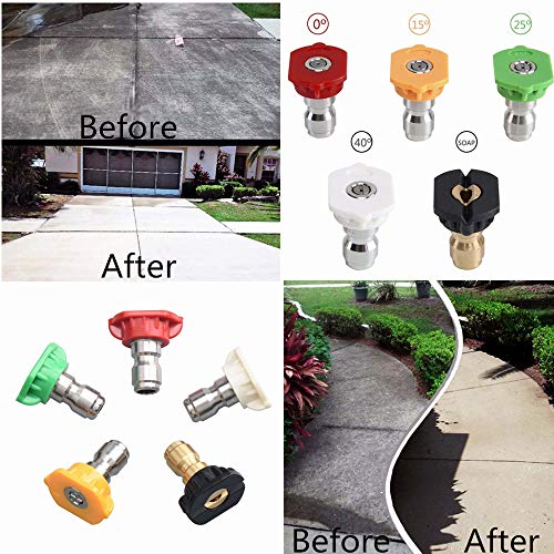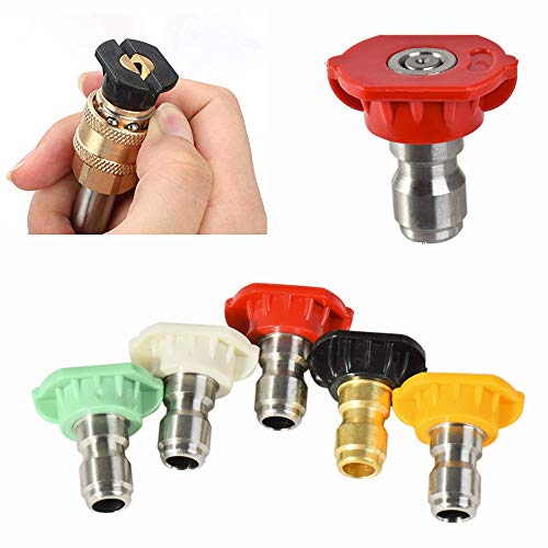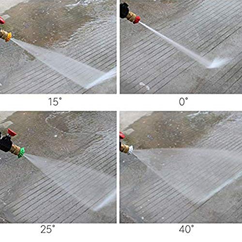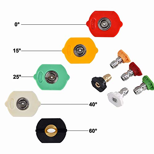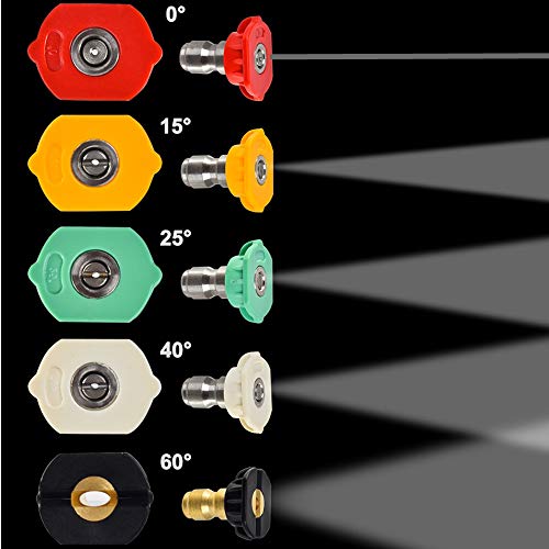 Package Includes:5 pcs Power Washer Nozzles with different spray patterns. (Red one 0°, yellow one 15°, green one 25°, white one 40°, black one 65°) .Orifice size 2.5