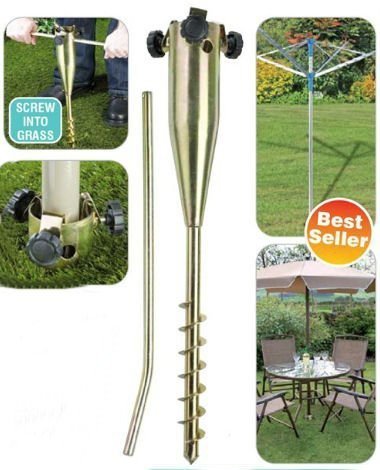 Heavy Duty Metal Parasol Spike - EASY TO USE This heavy duty Rust Resistant Zinc Plated Screw-In Ground Spike provides rock solid support for garden parasols, rotary dryers, bird feeders, flags etc. It simply screws into the ground using the provided turn rod and can be easily unscrewed and moved around as required. Simply insert the item you want to secure and tighten the 3 screws at the top of the unit. Product Features: Simple to use screw-in system Ideal for garden parasols, rotary dryers, gazebos, bird feeders, flags etc. Also great for outdoor activity poles such as badminton and swing ball Can be unscrewed and moved around as required Comes with simple to use turn rod Steel with rust resistant zinc plating Suitable for poles with a diameter from 2.5cm to 5.5cm Length: 56cm (22ins)