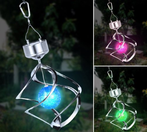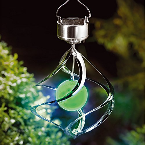A unique and attractive addition to your garden. The colour changing glass ball lights up at night to illuminate the dancing spinner give a stunning effect.