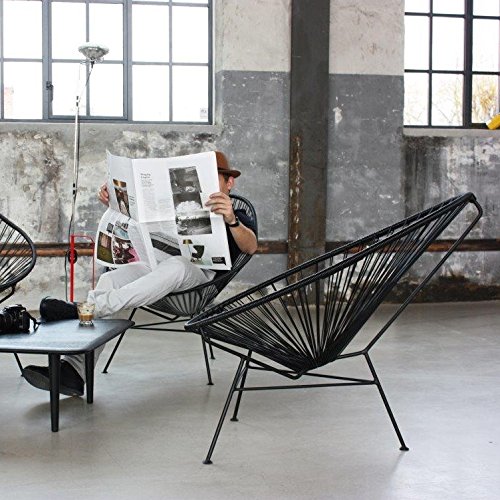 Inspired by 1950’s Acapulco chairs, this classic matt black coloured string chair has been woven from high quality durable plastic around a strong metal frame. Each chair has been designed for optimum comfort with a cocoon shape centre and high back. Ideal for outdoor lounging during the Summer months, this large chair will also add a contemporary twist to your inside space.