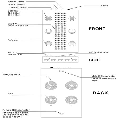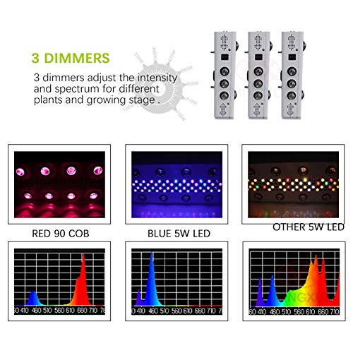 ✔ Dimmable/Widely Used: One switch control the light on/off, three dimmers to adjust the intensity of integrated COB and all 5W LED operation respectively,veg/grow/bloom and full spectrum modes, equal to four traditional lights, suit for clone, vegetable and flowering stages