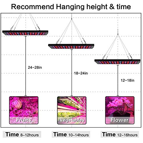 Recommended lighting time and heightSeedling Stage: 16-18 hours on, 36-59inch; The lighting time and height can be adjusted Accor- ding to the site environment and specific plant plants