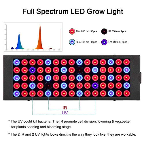 LED chip: SMD30301-3W Red 620-630nm 84PCS; SMD3030 1-3W Blue 460-470nm 10PCS; SMD30301-3W White 6000-6500K 2PC ;SSMD28351-3W UV 390-400nm 2PCS ;SMD28351-3W IR 725-735NM 2PCS