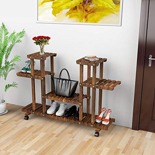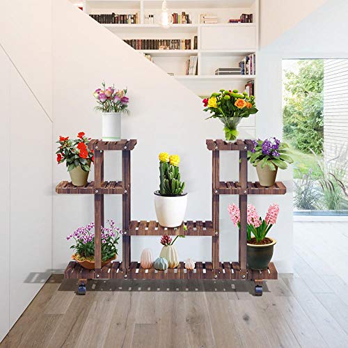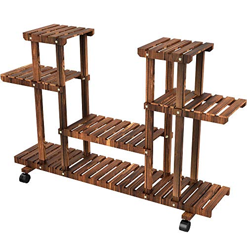 Yaheetech Removable Multi-Layer Plant Stand Display Racks with Garden Wooden Shelving Balcony Decoration Flower Stand with Wheels,Solid Wood,124 x 33 x 80 cm